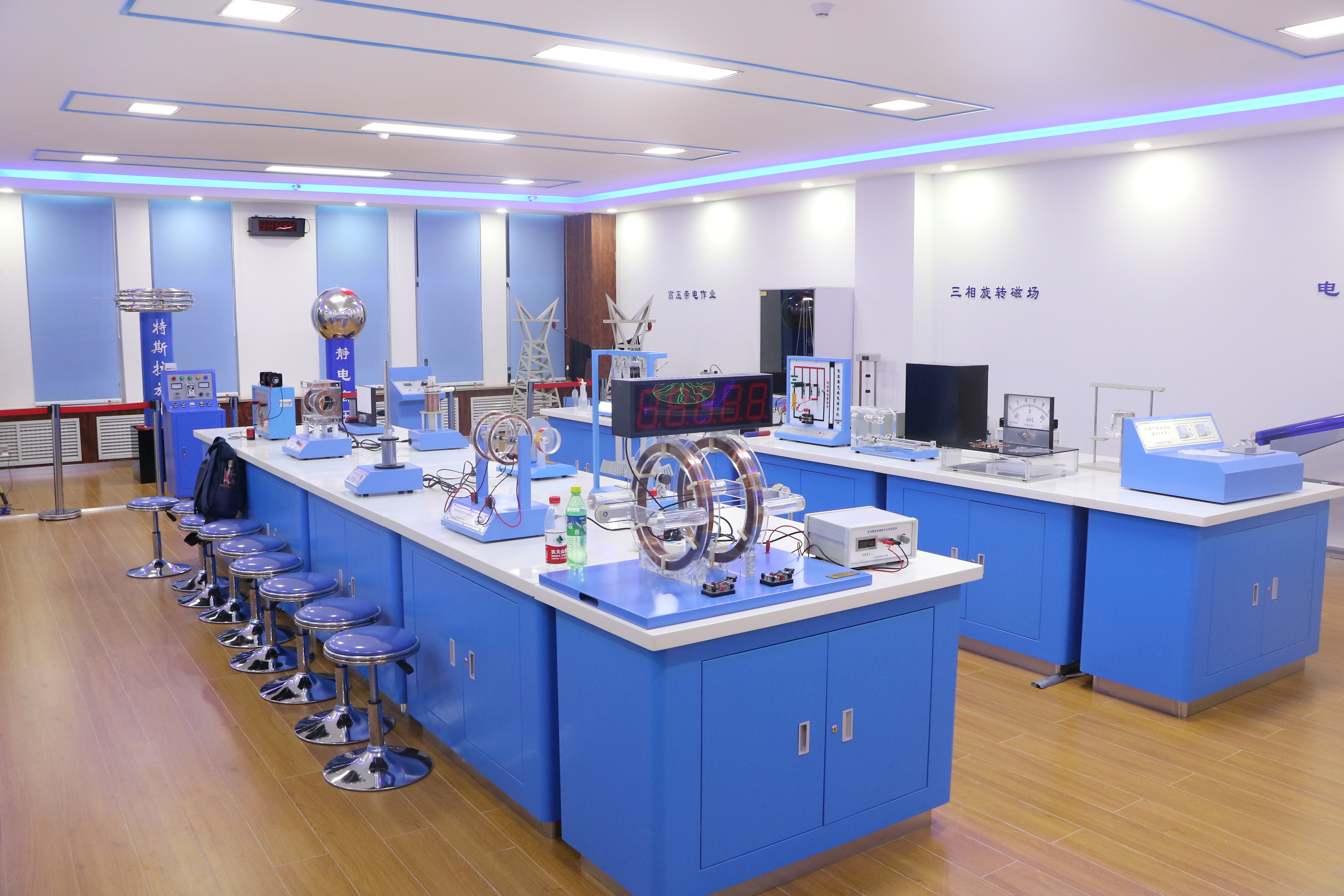 电磁学演示实验室内有大型法拉第笼、静电高压、电风吹烛、避雷针、平行板电容器、楞次转环、“同性相吸”的磁铁、电磁炮、洛伦兹力演示仪等电磁学相关的仪器设备,可以帮助学生更好的理解电场、电容、静电屏蔽、楞次定律、法拉第电磁感应定律、安培力、磁场等知识点。