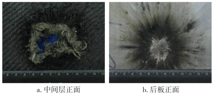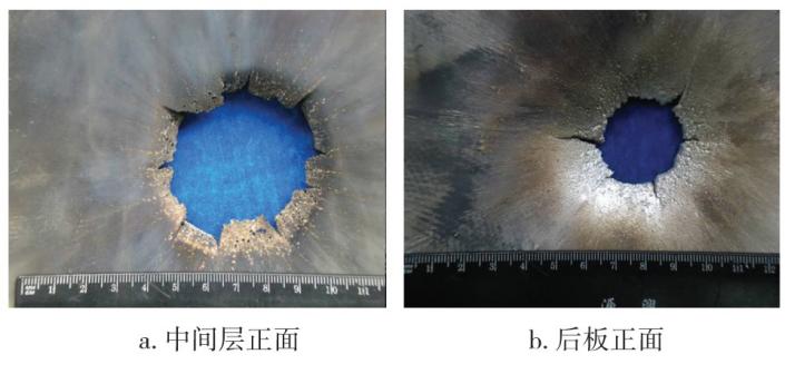 三层铝板结构损伤照片(v=6.43km/s,d=6.50cm)