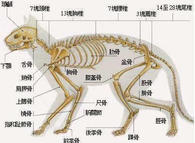 此外,猫的脊椎之间的间距十分大,其间还穿插着厚而有弹性的纤维软骨。构成脊椎的骨头几乎都是不正形骨,肋骨是长的弓形骨,这些骨头都小而弯曲,有利于猫的胸骨的压缩,使身体变细变软[2]。