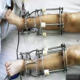 首先,由于“肢体延长器”所使用的钢针要穿过患者双腿的皮肤以及软组织,稍有不慎则可能造成感染或者损伤肌肉的神经组织;其次,在手术实施过程中,患者膝关节压力增大,很容易造成后期无法恢复的残疾;另外,若“肢体延长器”放置不正,则也有可能导致患者下肢畸形或双下肢不等长等严重后果;最后,肢体延长过快极易使得腿部神经或血管损伤,长期固定也会导致患者下肢肌肉萎缩,即使手术成功,恢复成本也很高。
