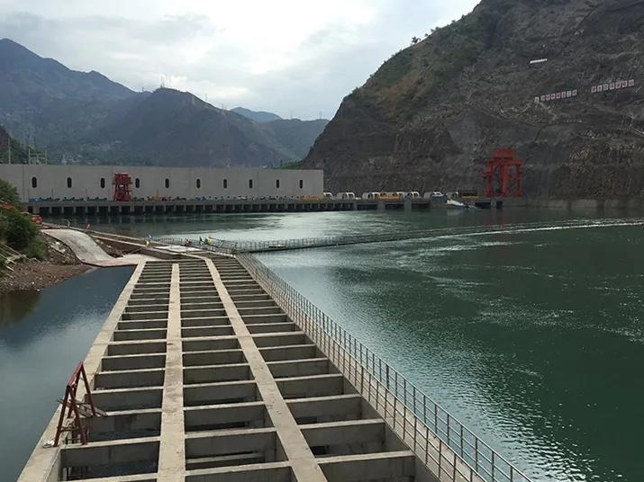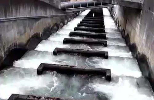 鱼梯——帮助鱼类跨越大坝的水中楼梯,是鱼群跨越水电站到上游产卵地的人工鱼道,其中部设有凹形挡板作为洄游休憩地,与楼梯有着相似的原理,旨在降低自上而下的坡度。鱼梯的长度取决于大坝的高度,高度越高,鱼梯也就越长。