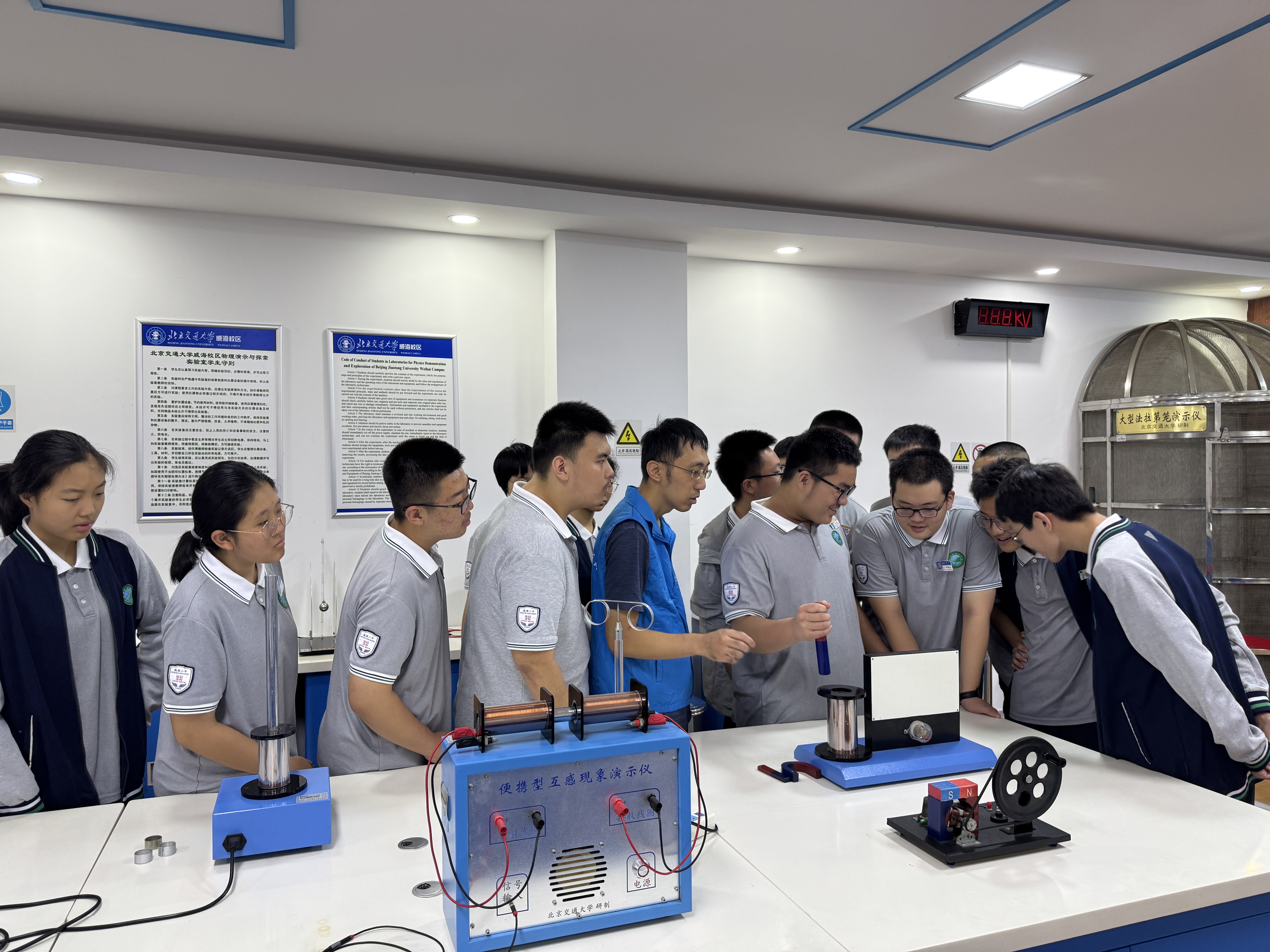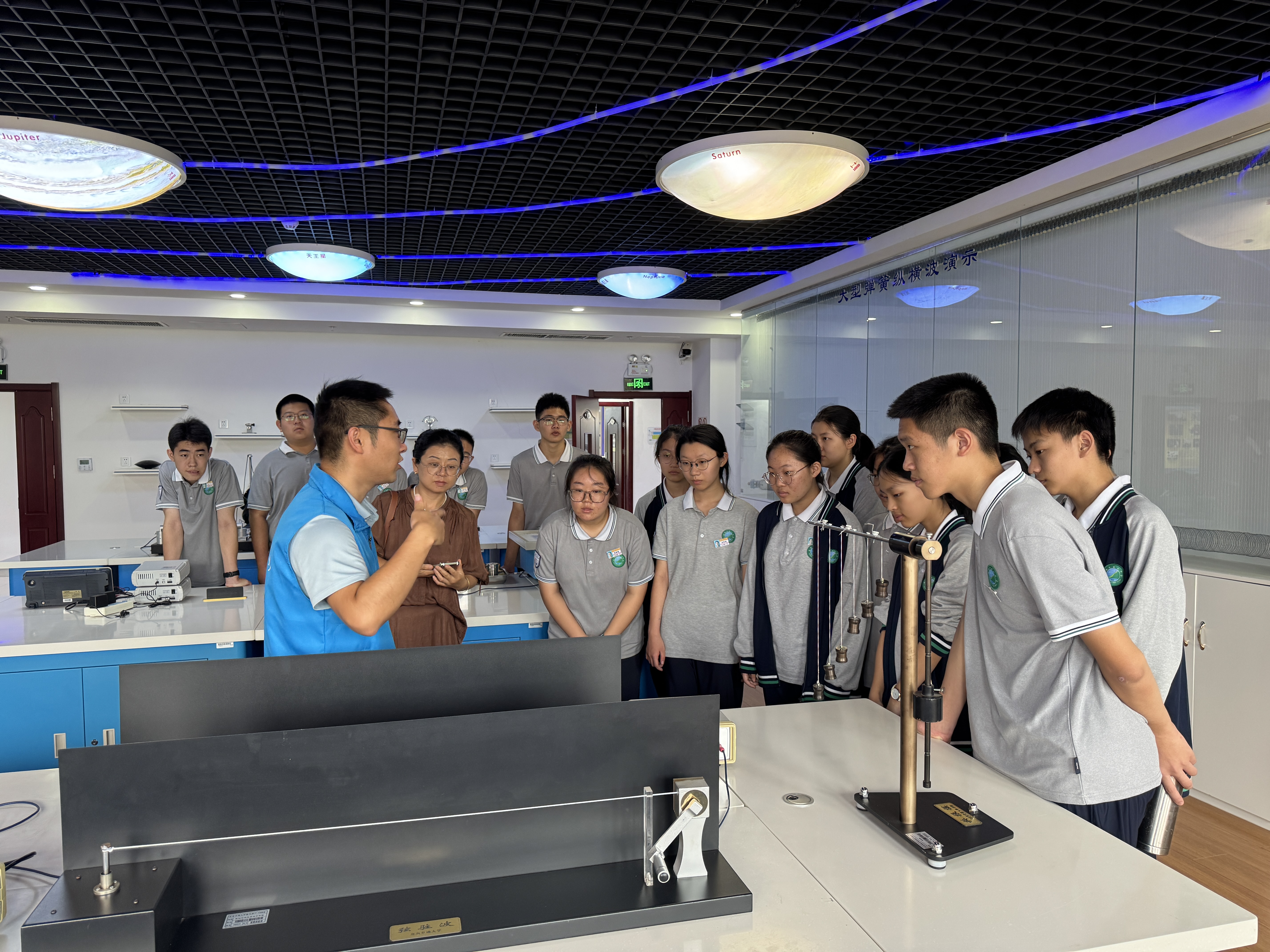 威海市第二中学的教师和同学们依次参观了力学、电磁学、振动与波、光学、立体与综合、热学与综合演示等实验室,体验了角动量守恒转台、茹科夫斯基凳、特斯拉放电演示仪、大型法拉第笼、大型弹簧纵横波演示仪、蛇形摆、衍射光栅、3D电影和超导磁悬浮列车等众多科普演示项目。