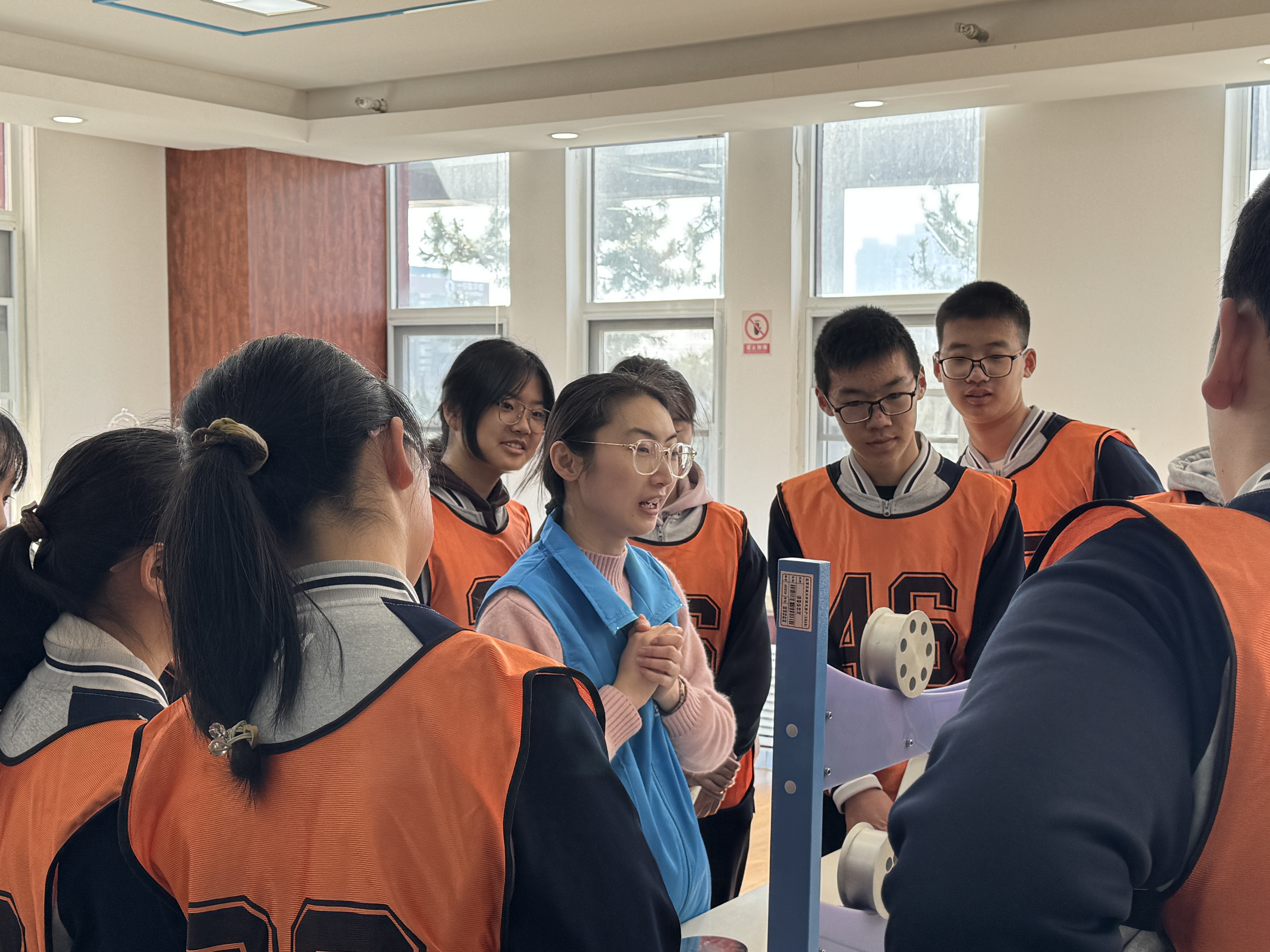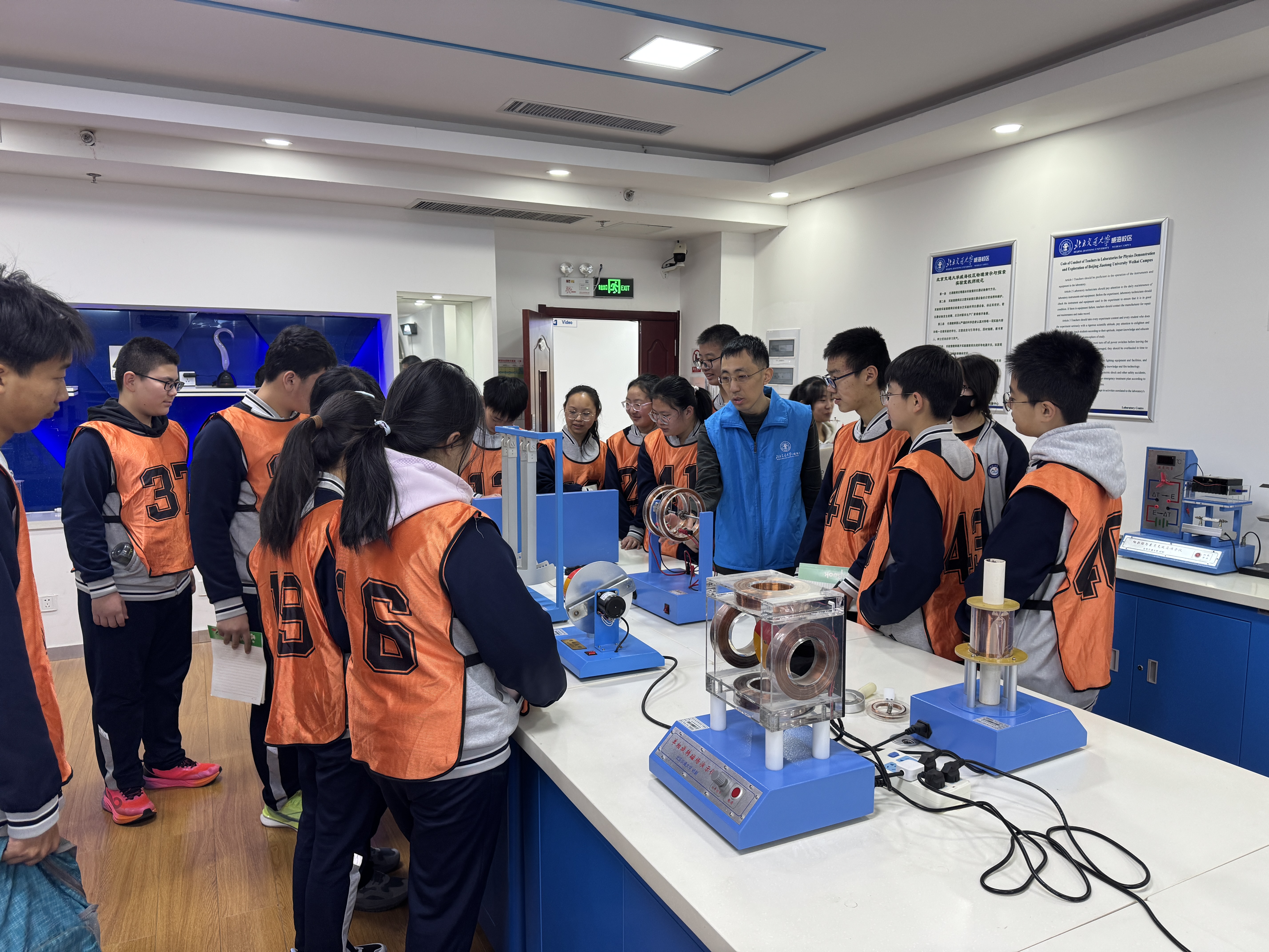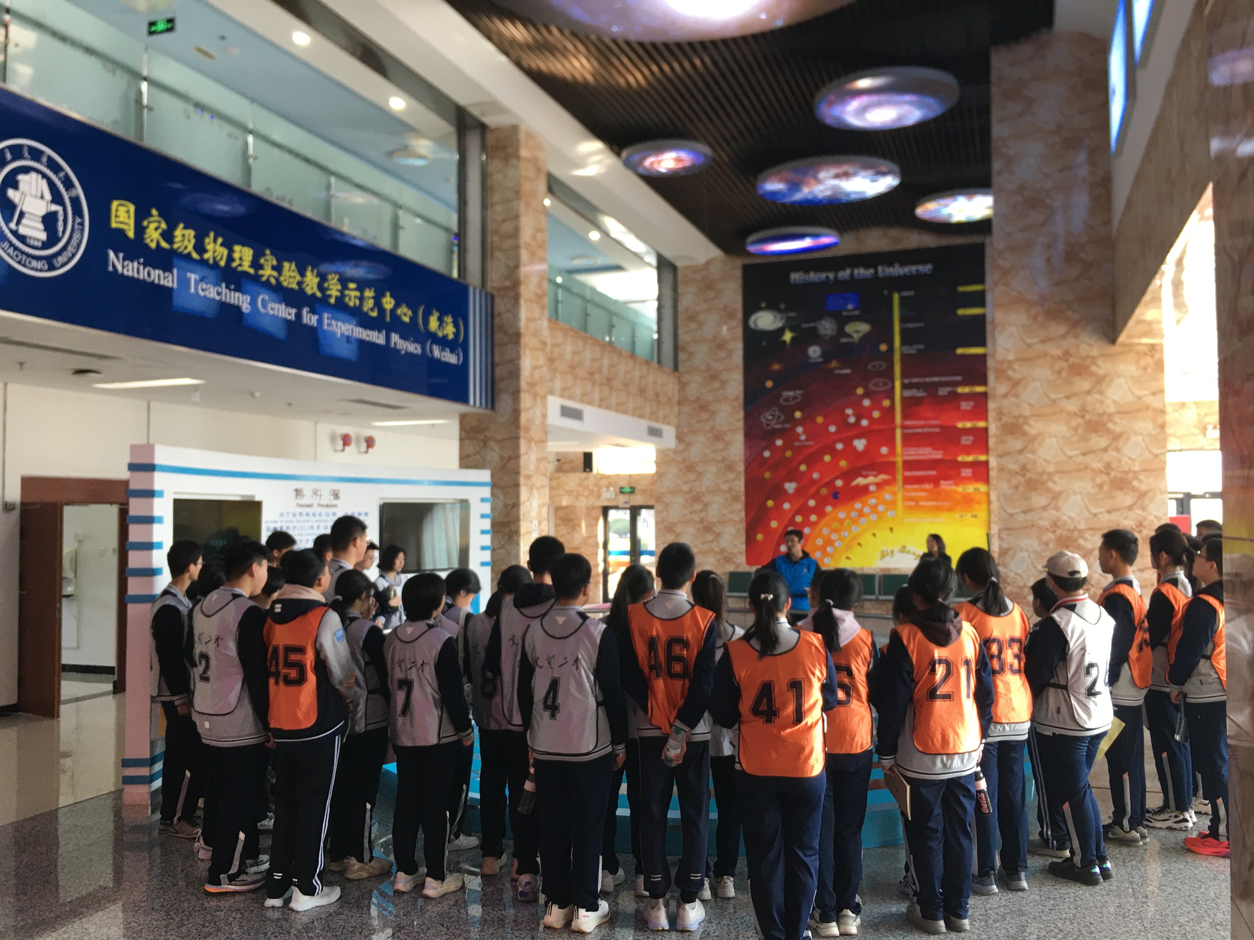 山东省文登第二中学的教师和同学们依次参观了力学、电磁学、振动与波、光学、立体与综合和热学与综合演示实验室,体验了角动量守恒转台、茹科夫斯基凳、特斯拉放电演示仪、大型法拉第笼、大型弹簧纵横波演示仪、衍射光栅、3D电影和超导磁悬浮列车等众多科普演示项目。