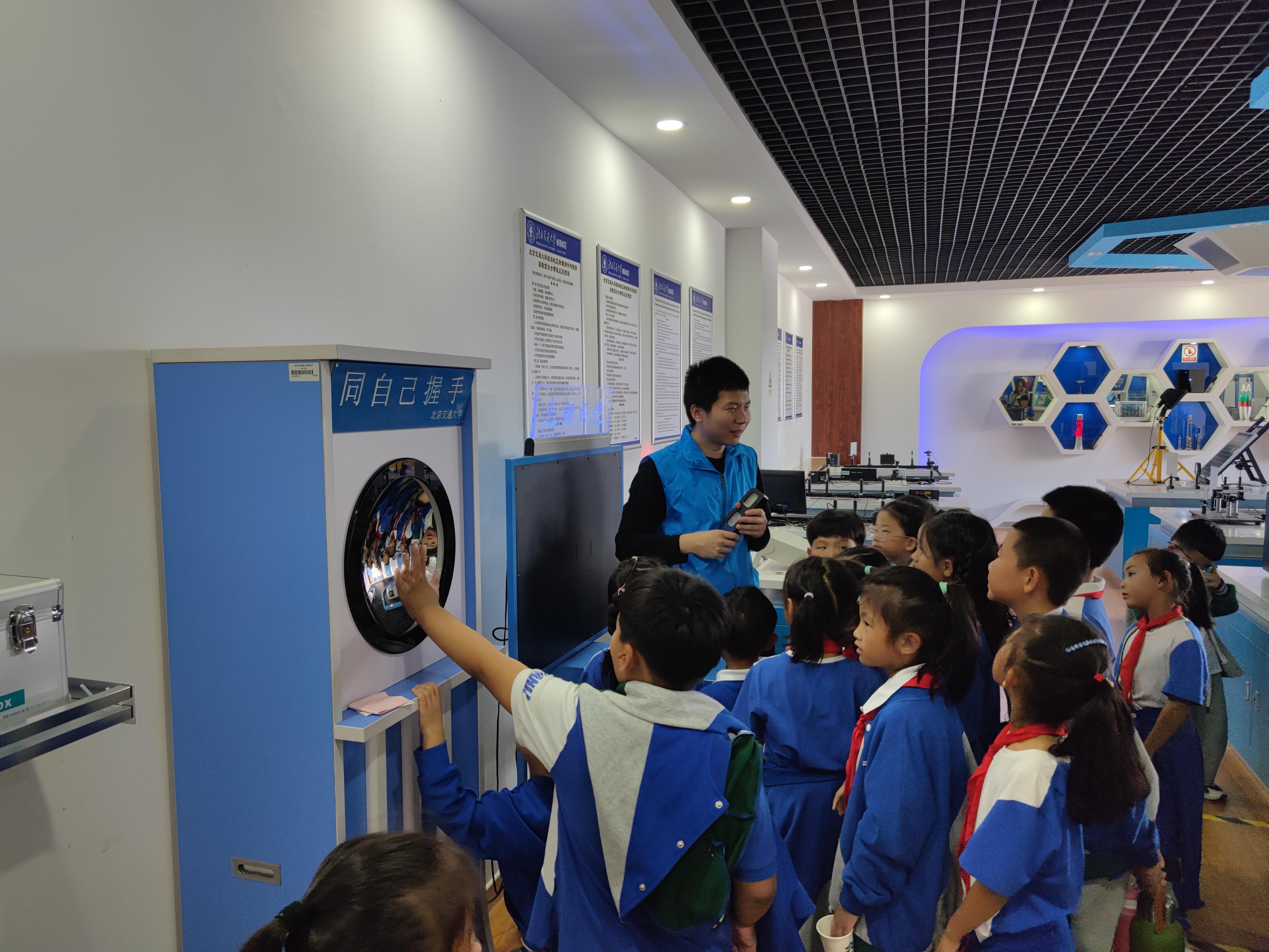10月11日,威海南海新区天立学校的一年级至五年级的76名学生在德育主任廖运琳和15名教师的带领下来威海校区科普教育基地参观。科普教育基地的5名实验教师和1名学生志愿者接待了参观人员。
