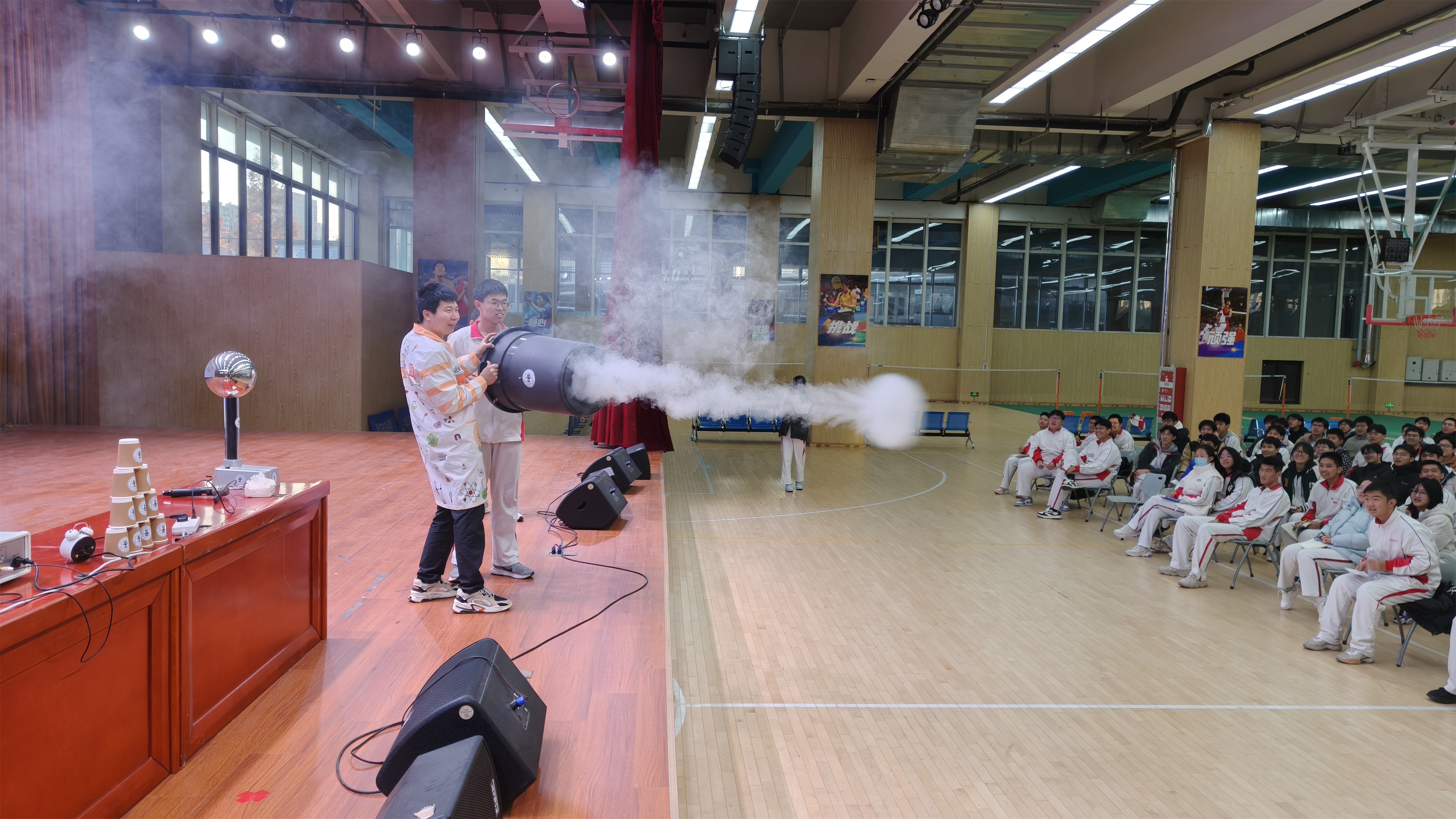威海校区科普教育基地实验团队的齐敬强、玄大悦和林凡庆三位教师与山东组招生组徐小萌老师一行,带着精心设计的实验器材与宣讲资料走进高中校园。活动现场,科普实验秀环节率先拉开帷幕。实验团队以“趣味实验 + 原理讲解”的形式,将抽象的科学知识转化为生动的直观体验。空气炮、火焰掌、触摸闪电、超导磁悬浮、液氮蘑菇云、静电高压、粉尘爆炸等十几个精彩实验轮番上演,神奇的现象引得台下学生阵阵惊呼,大家纷纷举手,主动参与实验操作,沉浸式感受科学的独特魅力。实验间隙,齐敬强还结合北京交通大学在轨道交通、通信工程等领域的学科优势,讲解科学知识在前沿科技中的应用,引导学生树立“学科学、用科学”的思维。