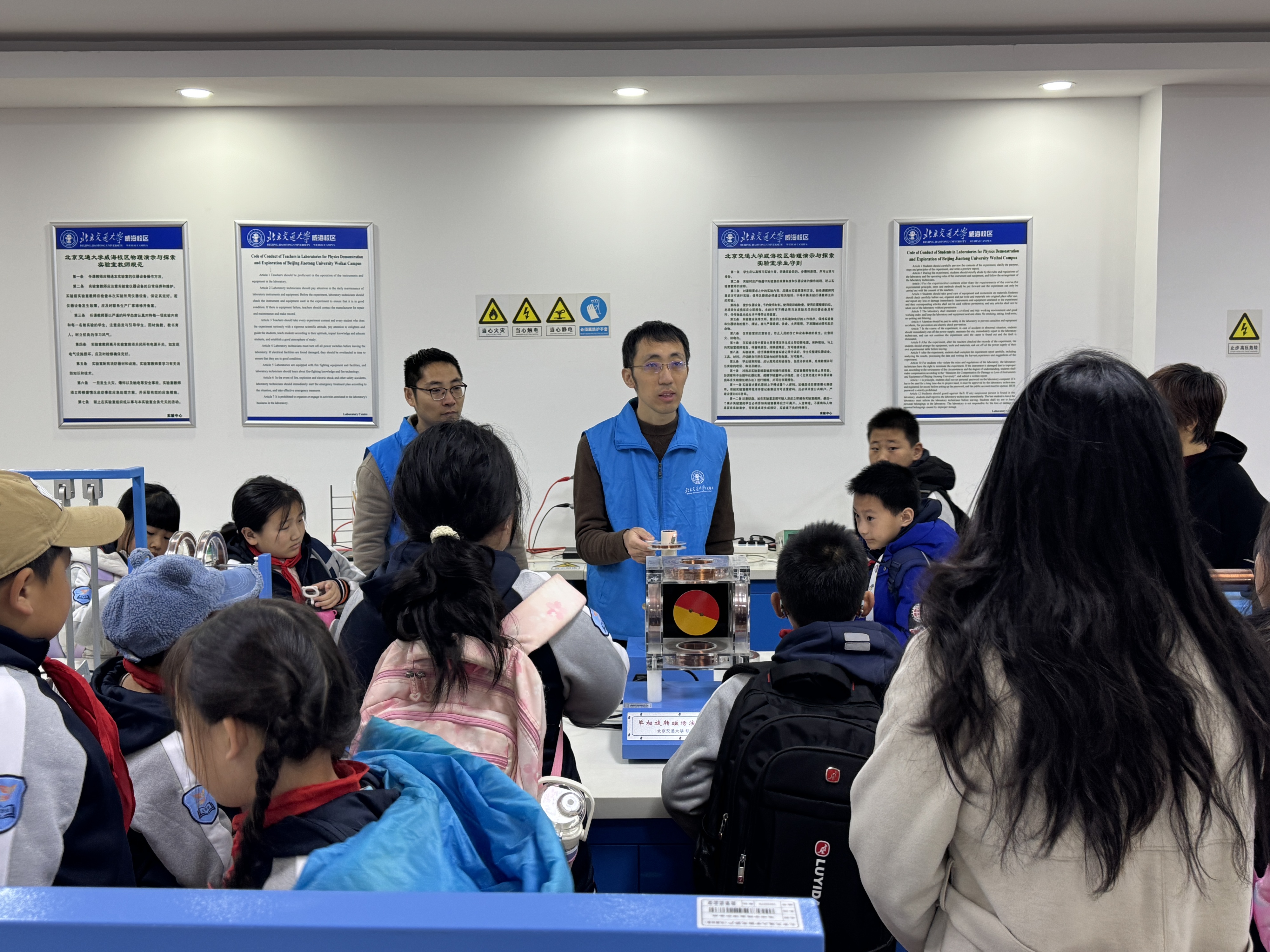 On November 19th, 12 teachers and 38 students from Jieshi School in Wendeng District, Weihai City, visited the Popular Science Base of BJTU Weihai Campus. Five experimental teachers from the base received the visitors.