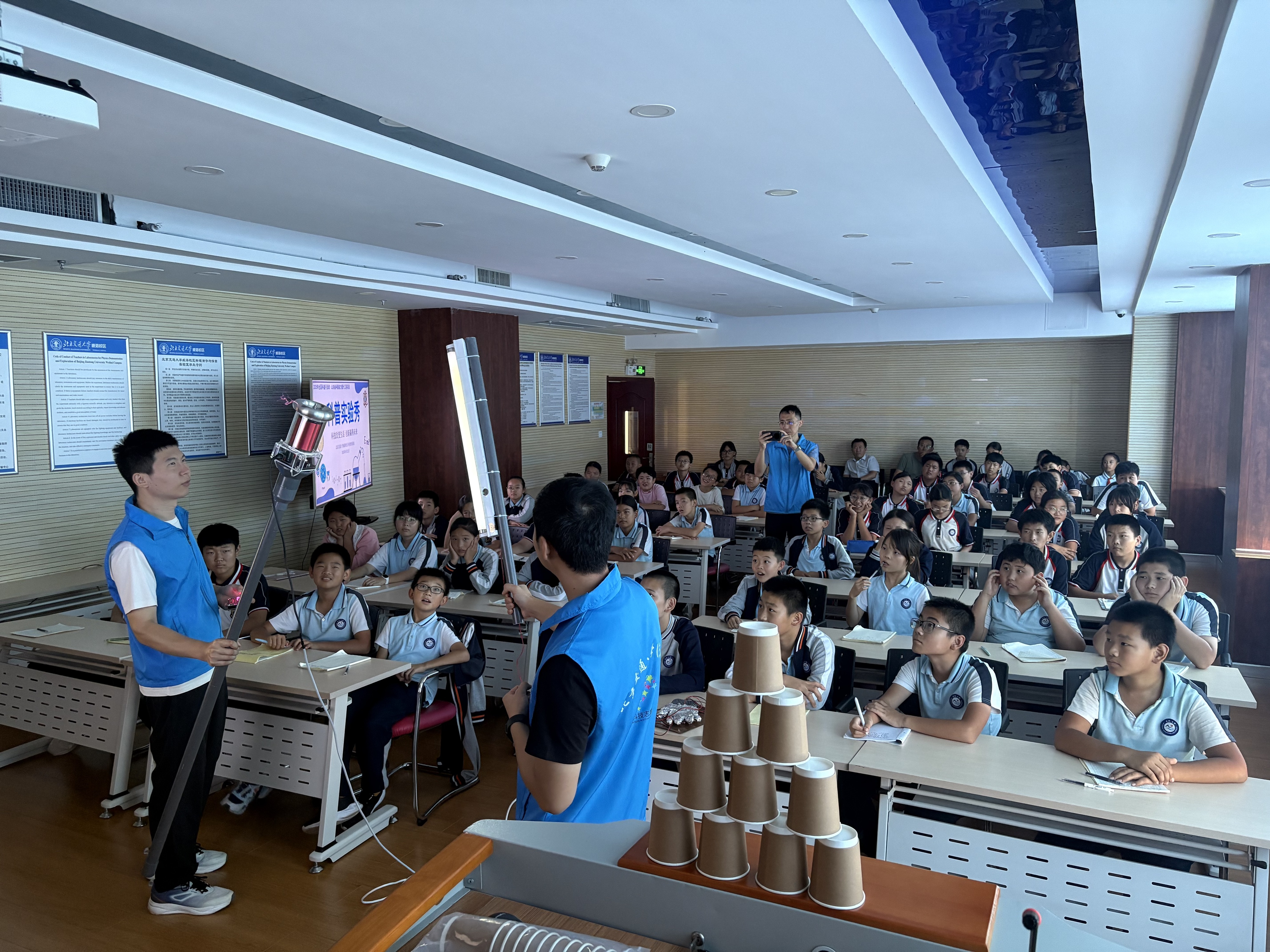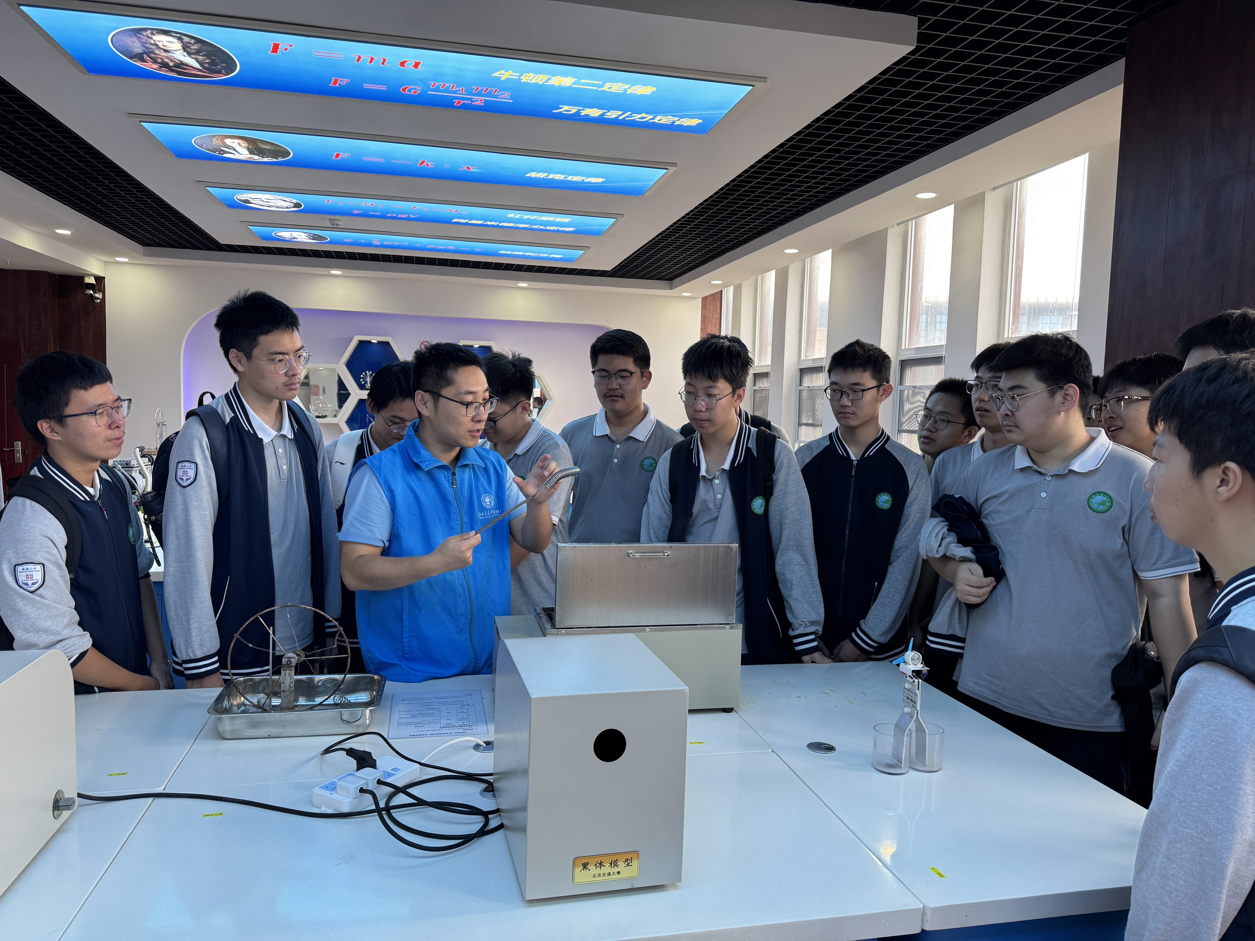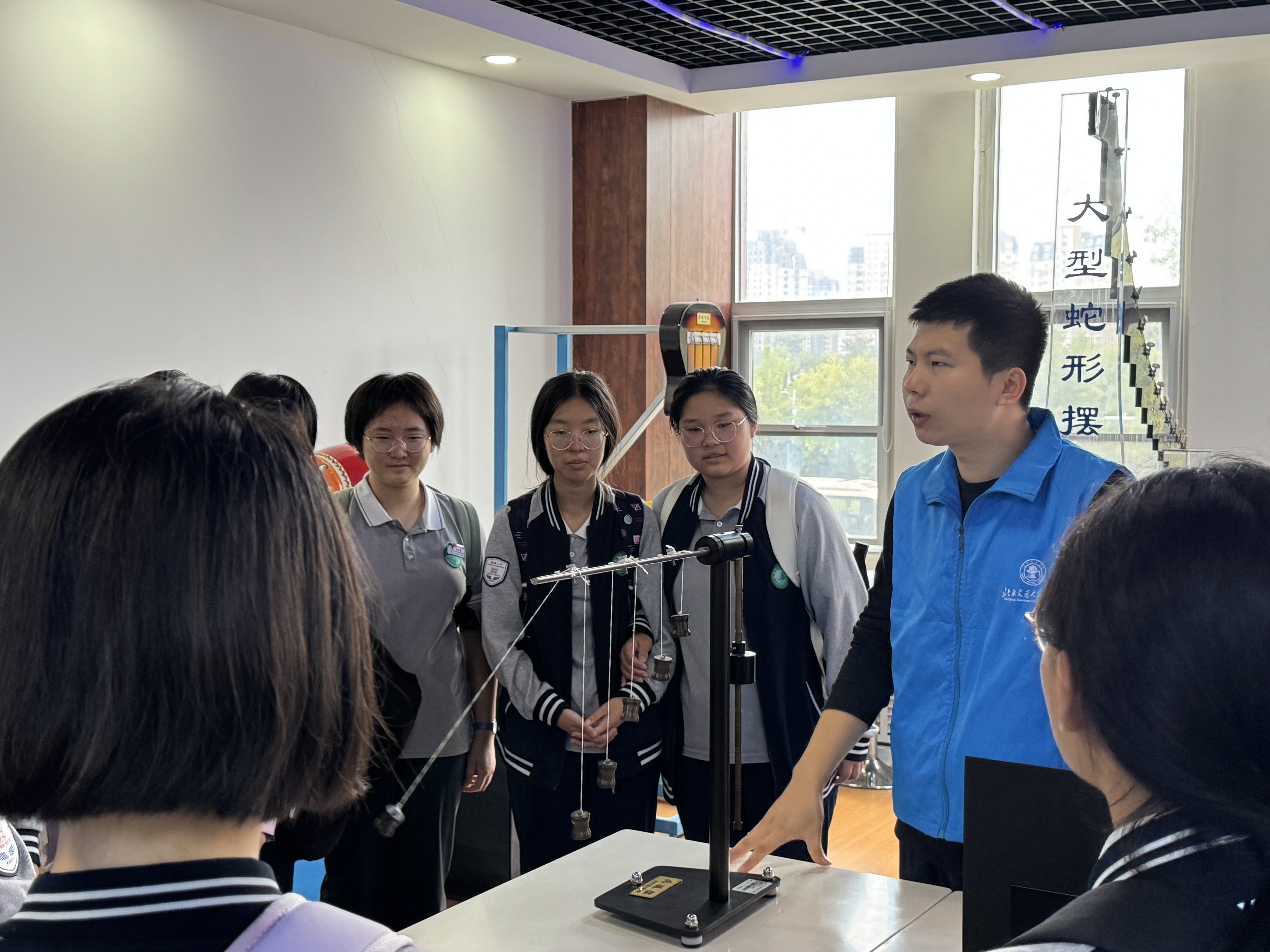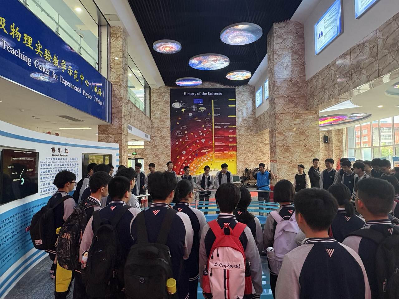 两所学校的学生们依次参观了力学、电磁学、振动与波、光学、立体与综合和热学与综合演示实验室,体验了傅科摆、伯努利原理演示仪、共振摆、发电机演示仪、偏振光立体电影、形状记忆合金等众多科普演示项目。