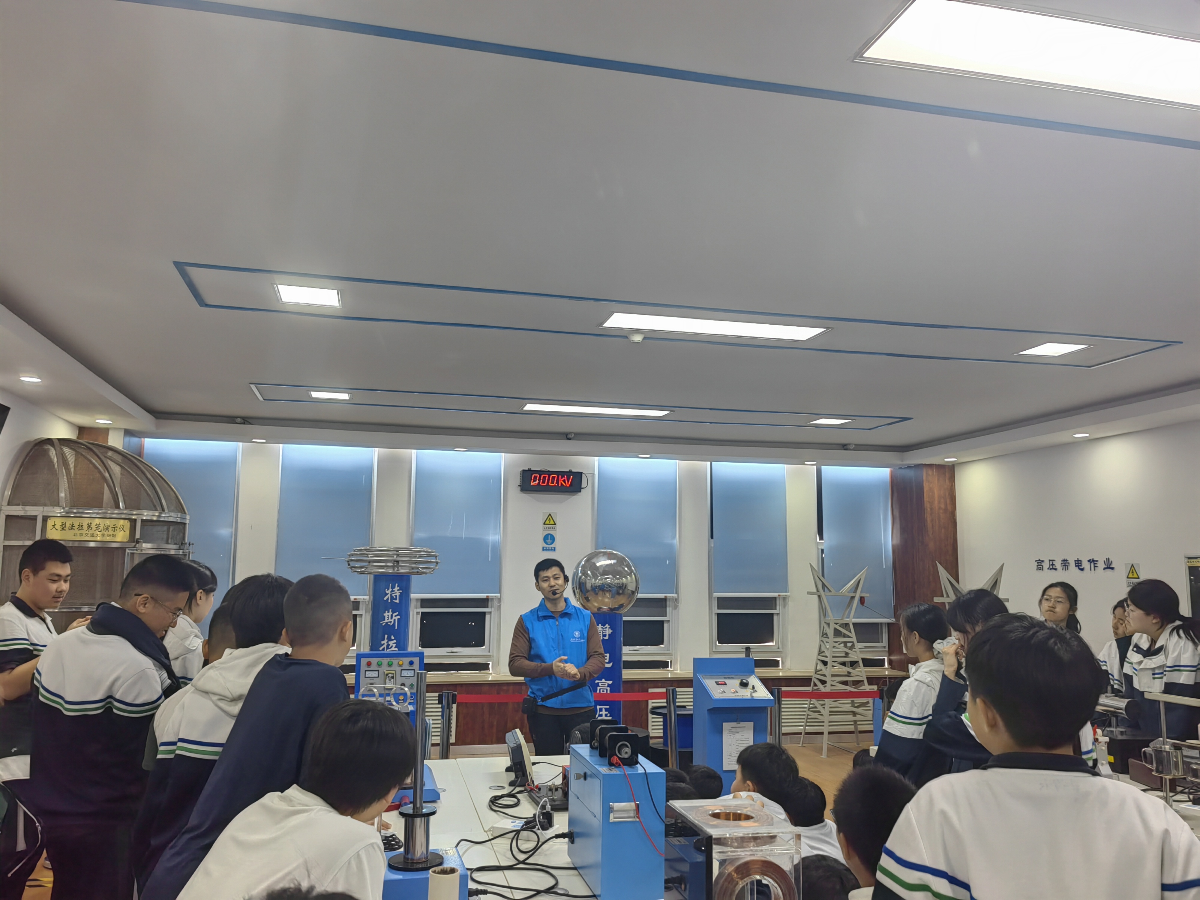威海南海新区天立学校的教师和同学们依次参观了力学、电磁学、振动与波、光学、立体与综合、热学与综合演示实验室,体验了角动量守恒转台、直升机演示仪、特斯拉放电演示仪、大型法拉第笼、大型弹簧纵横波演示仪、共振摆、衍射光栅、3D电影和蒸汽机演示仪等众多科普演示项目。